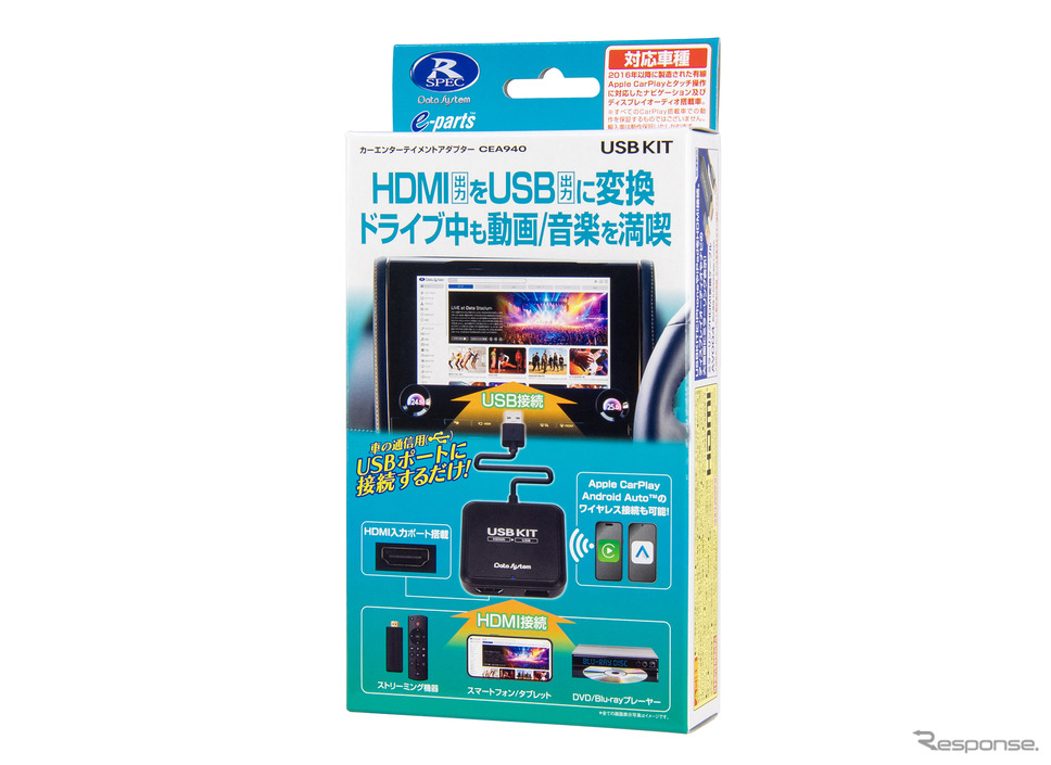 데이터시스템이 유선 연결 방식의 Apple CarPlay/Android Auto에 대응하는 차량용 디스플레이와 내비게이션에 HDMI 기기를 연결할 수 있는 USB-HDMI 변환 어댑터 「カーエンターテイメントアダプター USBKIT CEA940」를 출시했다. 가격은 1만 8,700엔(부가세 포함, 약 17만 원)이다.