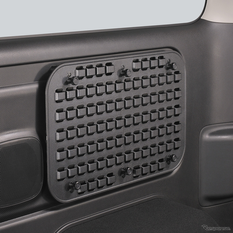 몰 패널은 좌측 후륜 타이어 하우스 위에 방치되기 쉬운 데드 스페이스를 활용 가능한 수납 공간으로 바꿔 주는 아이템이다. 타이어 하우스 상단의 유틸리티 너트를 사용하기 때문에 차체를 따로 가공할 필요가 없고, 십자드라이버 하나만 있으면 약 5분 안에 장착할 수 있다. MOLLE(몰) 시스템에 대응하는 구조로, 요철이 있는 패널 형상 덕분에 벨트를 통과시키기 쉽고, 몰 규격 액세서리를 자유롭게 배치할 수 있다. 전용 어태치먼트 4종이 각각 3개씩 기본 제공돼 공구나 소형 아이템, 가방 등을 걸어 둘 수 있다. 강도가 높은 ABS 수지를 사용해 가벼우면서도 높은 내구성을 확보했으며, 한 번 장착한 뒤에는 별도 공구 없이도 패널을 탈부착할 수 있다. ‘밴 타입’ 모델 가운데, 그레이드명에 ‘프리미엄 GX’ 또는 ‘AUTECH’가 포함된 트림 전용으로 제공된다.
