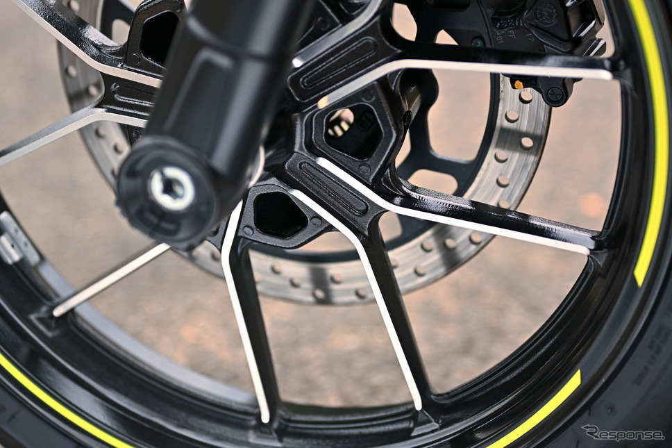 여기에 절삭 가공을 더한 엔케이 휠, 브론즈 컬러로 도색한 엔진, 스윙암 마운트 타입 펜더 같은 디테일이 더해지며, 차체 전체의 포름이 한층 단단하고 응축된 인상을 준다.