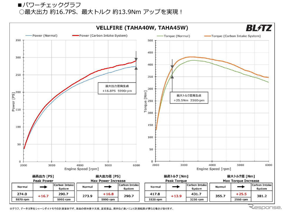 BLITZ의 자체 측정에 따르면 40계 벨파이어의 경우 이 시스템을 장착했을 때 최대출력은 약 16.7ps, 최대토크는 약 13.9Nm 향상된 것으로 나타났다.