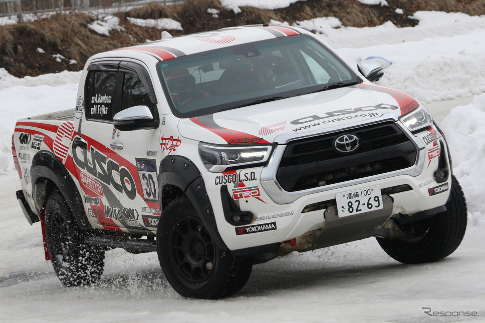 그 여파는 오프닝 스테이지인 SS1부터 뚜렷했다. 함께 열린 홋카이도 랠리 선수권에 4WD 터보 머신으로 나선 강호들 가운데서도 초반 리타이어가 잇따랐다. 그런 혼전 속에서 눈에 띄는 페이스를 보여준 팀이 개막전 준우승을 차지했던 포ーンサ리ーチョート 선수 조였다. 이들은 SS1과 SS2를 연달아 스테이지 베스트로 장식했고, SS4까지 제압하며 클로즈드 코스 4개 스테이지를 마쳤을 때 클래스 선두로 올라섰다. 그 뒤를 추격한 팀은 개막전 우승을 차지했던 반바 아키라 선수와 후지타 메구미 선수가 탄 ‘CUSCO YH 지오란더·하이럭스’였다. 두 팀 모두 요코하마 고무의 SUV용 스터드리스 타이어 ‘iceGUARD SUV G075’를 장착해, 원투 포메이션을 이룬 채 전반 레이스를折り返した.