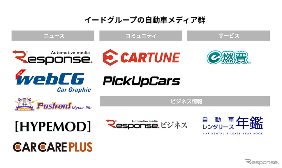 이드는 ‘AI 미디어 컴퍼니’를 내걸고 21개 장르, 84개의 디지털 미디어를 운영 중이다. 자동차 분야에서는 ‘レスポンス(리스폰스)’, ‘CARTUNE’, ‘e연비’, ‘Push on! Mycar-life’, ‘[HYPEMOD]’, ‘CAR CARE PLUS’ 등을 전개하며, 뉴스, 비즈니스, 취미, 정비, 이벤트, 커뮤니티 운영에 이르기까지 폭넓은 접점을 구축해 왔다.