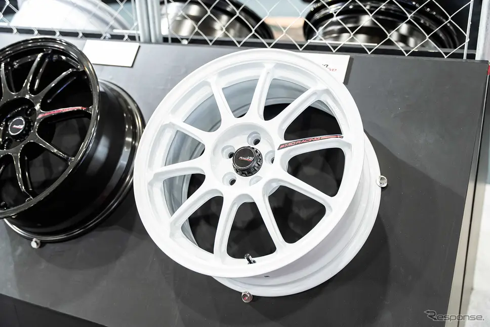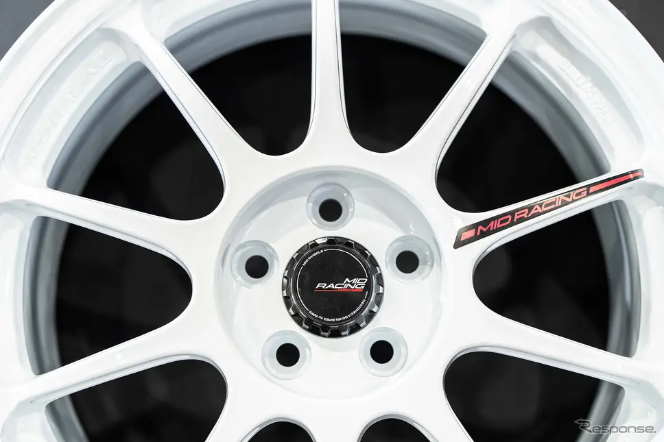 부스 정면 전시 패널에서 가장 강하게 밀어붙인 모델이 바로 MID 레이싱의 신작 R10 EVO다. MID는 도쿄 오토 살롱 2026 공개 이후 사용자 조사를 거쳐, 그 피드백을 바탕으로 컬러 라인업을 다듬는 전략을 취했다. 그 결과 오사카 오토메세 2026에서는 화이트와 블랙 메탈릭, 두 가지 색상이 데뷔했다. 둘 다 레이싱 이미지를 강하게 풍기는 스포츠 휠의 정석이면서, 폭넓은 차종에 무난하게 어울리는 컬러 선택이다.