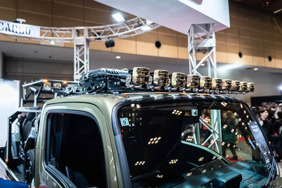 전시 차량의 핵심은 치밀하게 손질한 외장 디테일이다. 외장 파츠 개발은 HARD CARGO가 전담했다. 엘프 mio 전용 프런트 가드는 이번 프로젝트를 위해 신규 설계된 아이템으로, 트럭의 인상을 한순간에 퍼스널 유즈 쪽으로 끌어당기는 커스텀 파츠로 눈길을 사로잡는다. 마커 장착 여부를 선택할 수 있는 사양으로 곧 출시가 예고돼 있다는 점도 업계의 관심을 모으기에 충분하다.