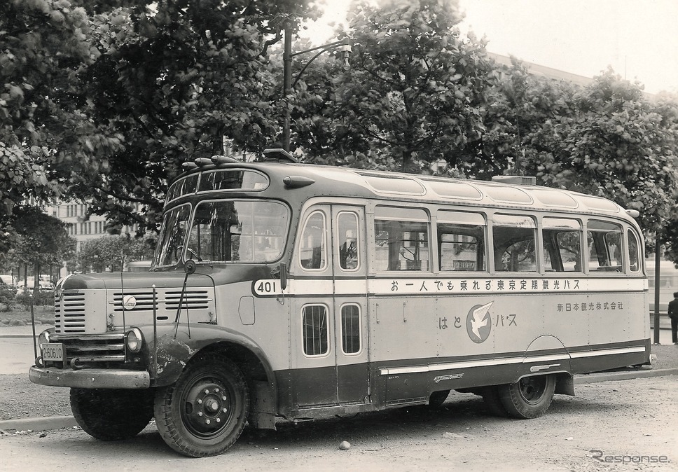 하토 버스는 1949년 3월 19일 도쿄 도내에서 정기 관광버스 운행을 시작했다. 창업 당시 사명은 ‘신일본관광’이었으며, 1948년 8월에 설립됐다. 1949년 3월에는 여성 가이드 1기 5명을 채용해 반일 A코스 운행을 시작했다. 운행 개시 불과 5일 전에 가이드를 채용한 셈이다.