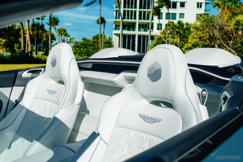 애스턴마틴 윙 로고는 숄더 볼스터에 스티치 처리됐고, 리어 캐빈의 카본 파이버 크로스 브레이스에는 외관과 동일한 클럽스포츠 화이트 리버리 핀스트라이프가 더해졌다. 레드 아노다이징 처리된 스타트/스톱 로터리는 해안에 떠 있는 부표 moti의 또 다른 시각적 암시다.
