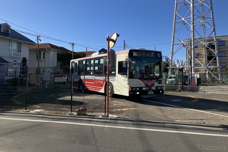 버스는 진행 방향 오른쪽에 있는 정류장 안으로 사선으로 진입해, 승객을 태운 채 턴테이블 위에 올라선다. 기둥에서 내려온 끈 끝에는 스위치가 달려 있고, 운전기사가 창 밖으로 손을 뻗어 이를 조작하면 턴테이블이 회전을 시작한다. 턴테이블의 방향이 180도 바뀌면 회전은 자동으로 멈춘다. 그러면 기사가 버스 문을 열고 승객이 내린다. 오기쿠보역 방면으로 되돌아갈 때는 문을 닫고 그대로 전진해, 왼쪽으로 핸들을 꺾어 왔던 길을 그대로 되돌아간다. 승·하차 자체가 턴테이블 위에서 이뤄진다는 점에서도 매우 이례적인 정류장이다.