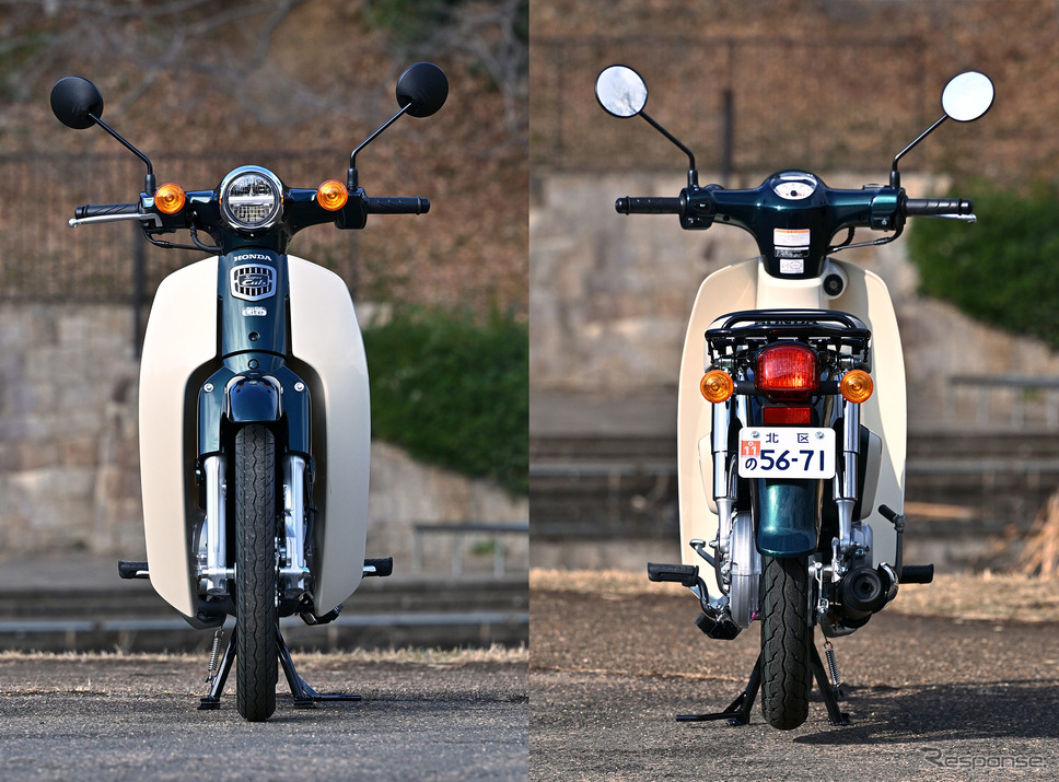 차체 크기, 시트고 738mm, 차량 중량 101kg 역시 슈퍼 커브 110과 같다. 2024년 12월에 파이널 에디션이 설정된 ‘슈퍼 커브 50’(배기량 49cc)과 비교하면 시트고는 3mm 더 높고, 차량 중량은 5kg 더 무겁다. 그 대신 엔진에는 훨씬 여유가 있다. 참고로 슈퍼 커브 50의 제원은 시트고 735mm, 차량 중량 96kg, 최고출력 3.7ps/7500rpm, 최대토크 3.8Nm/5500rpm이다.